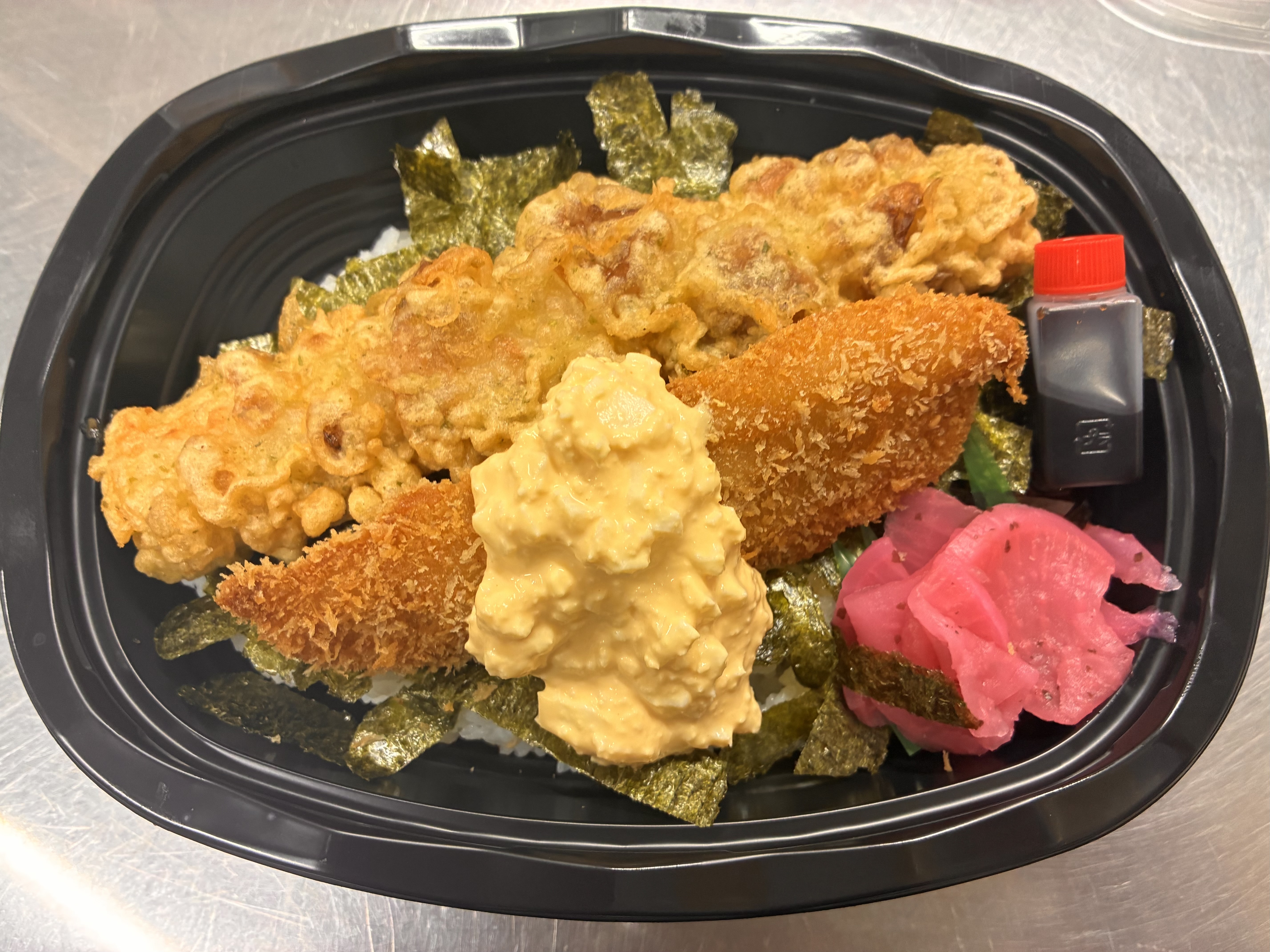 昔ながらの定番のり弁当。ご飯の上に昆布ともみのりを敷き詰め、白身魚のフライ、ちくわの磯辺揚げなど、懐かしい味わいのおかずがぎっしり。毎日食べても飽きない、シンプルで優しい味わいです。自家製タルタルとご一緒にどうぞ!