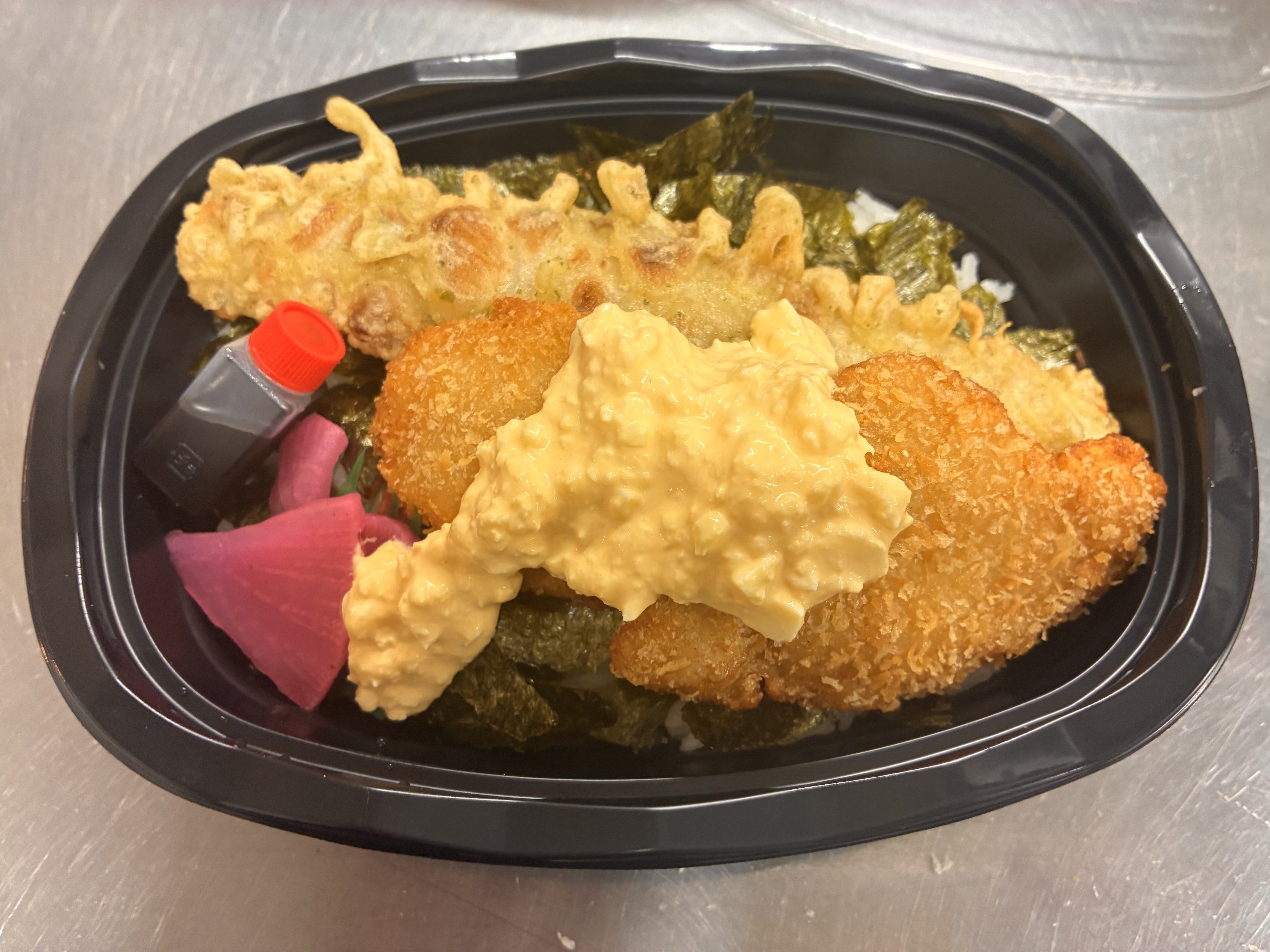 サクフワ鶏もも肉を甘酢ダレにくぐらせ、自家製タルタルソースをたっぷりかけました。酸味と甘みのバランスが絶妙な人気メニューです。