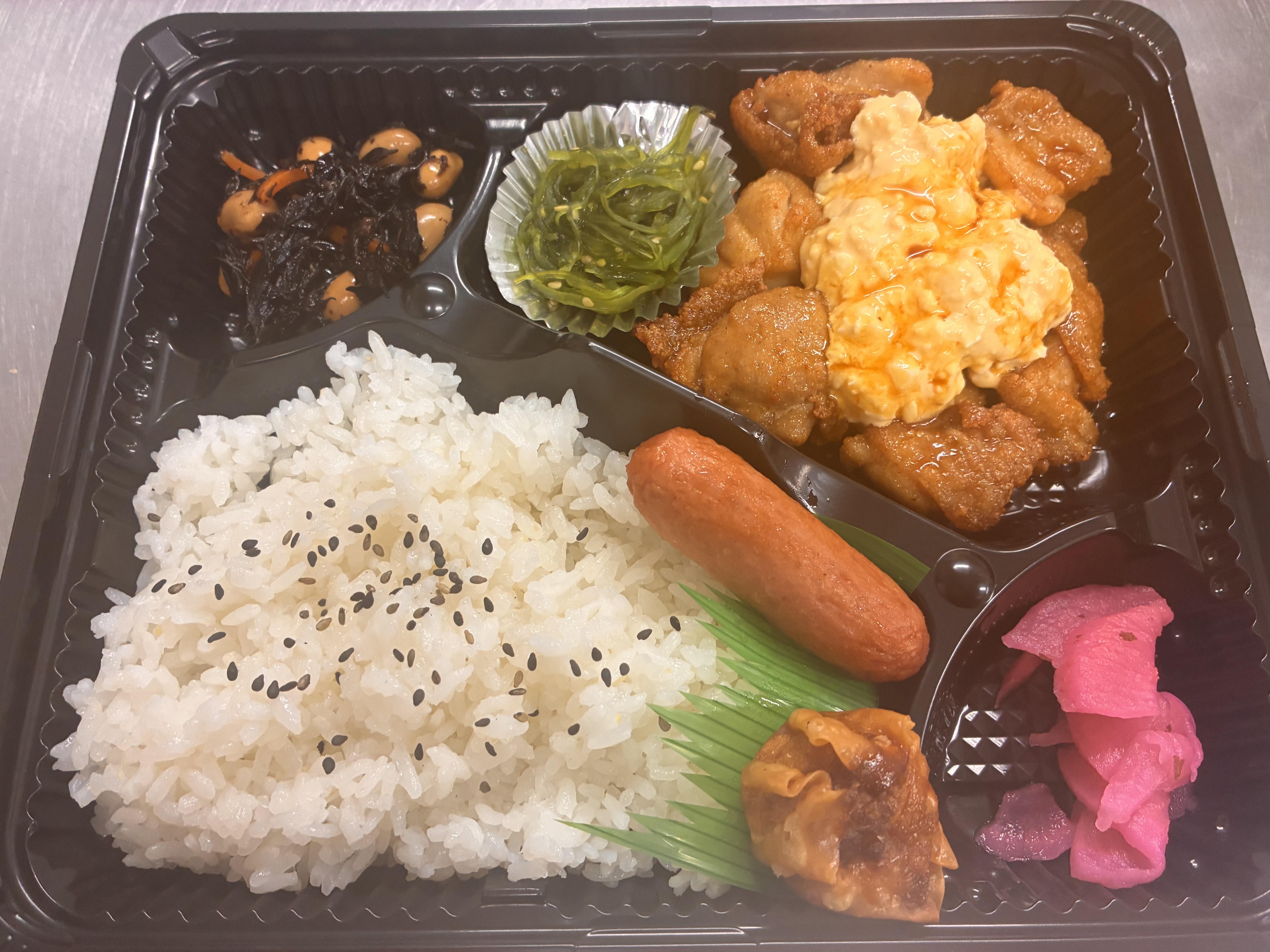手作りミンチカツとジューシーなからあげのダブルメイン。肉好きにはたまらない、食べ応え満点のボリューム弁当です。育ち盛りの方にもおすすめ。