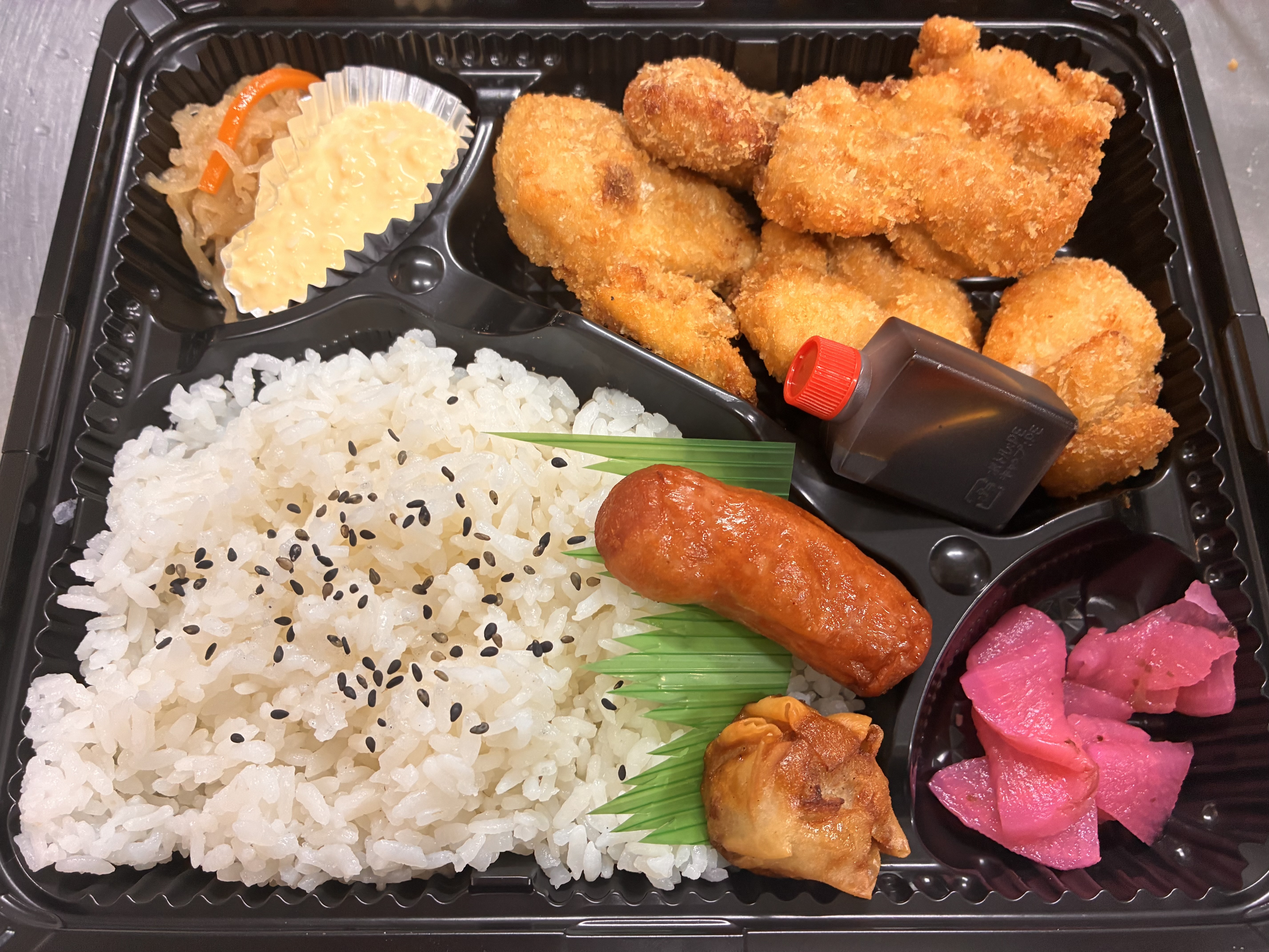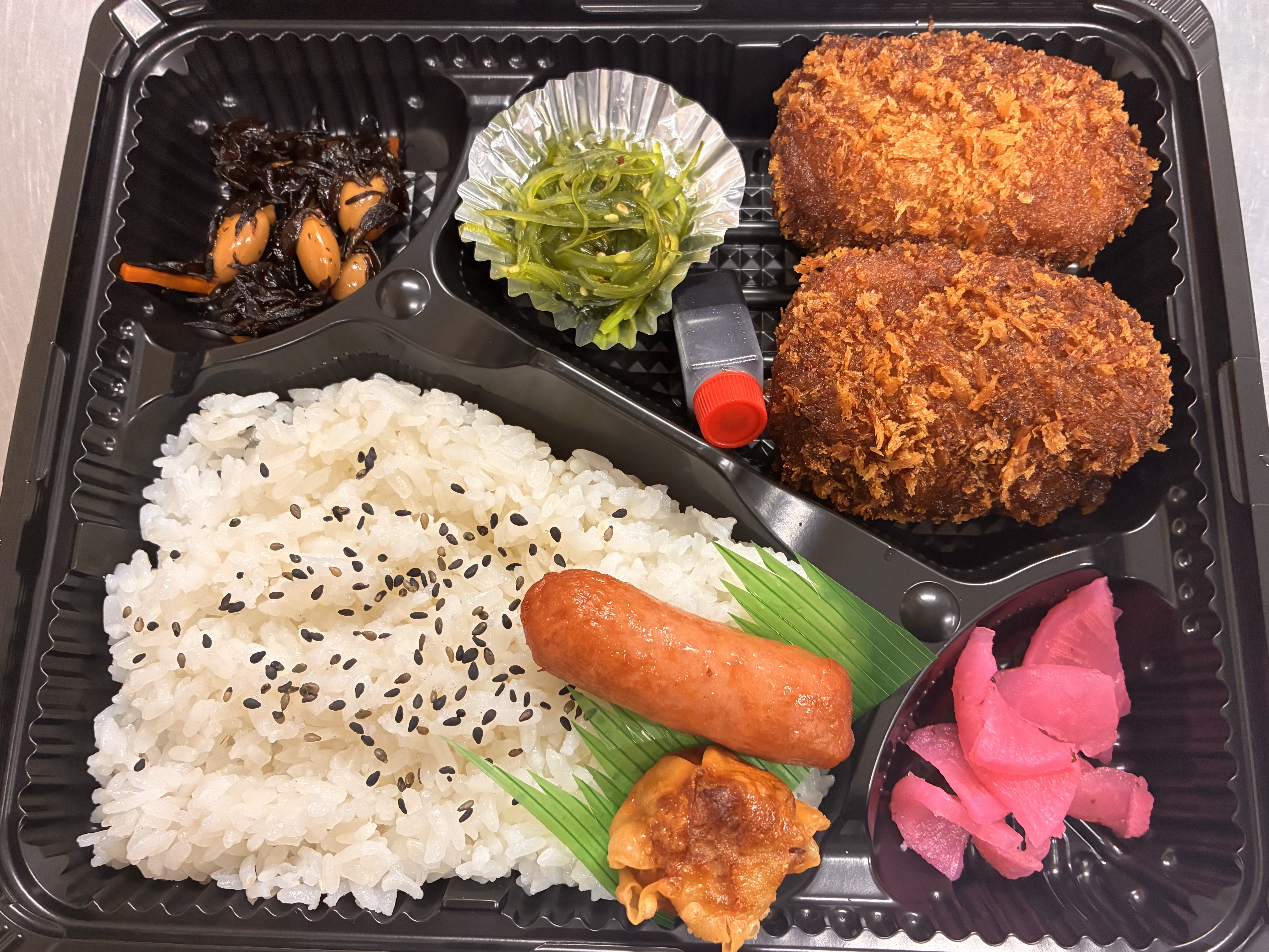 ジューシーなからあげと、ホクホクのコロッケが両方楽しめるお得なお弁当。揚げ物好きにはたまらない、人気のコンビネーションです。